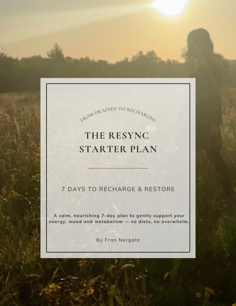 Inside my Resync & Restore programme, I help busy, overwhelmed individuals rebuild energy and hormonal balance through simple, sustainable nutrition and lifestyle shifts — no fad diets or calorie counting, ever.